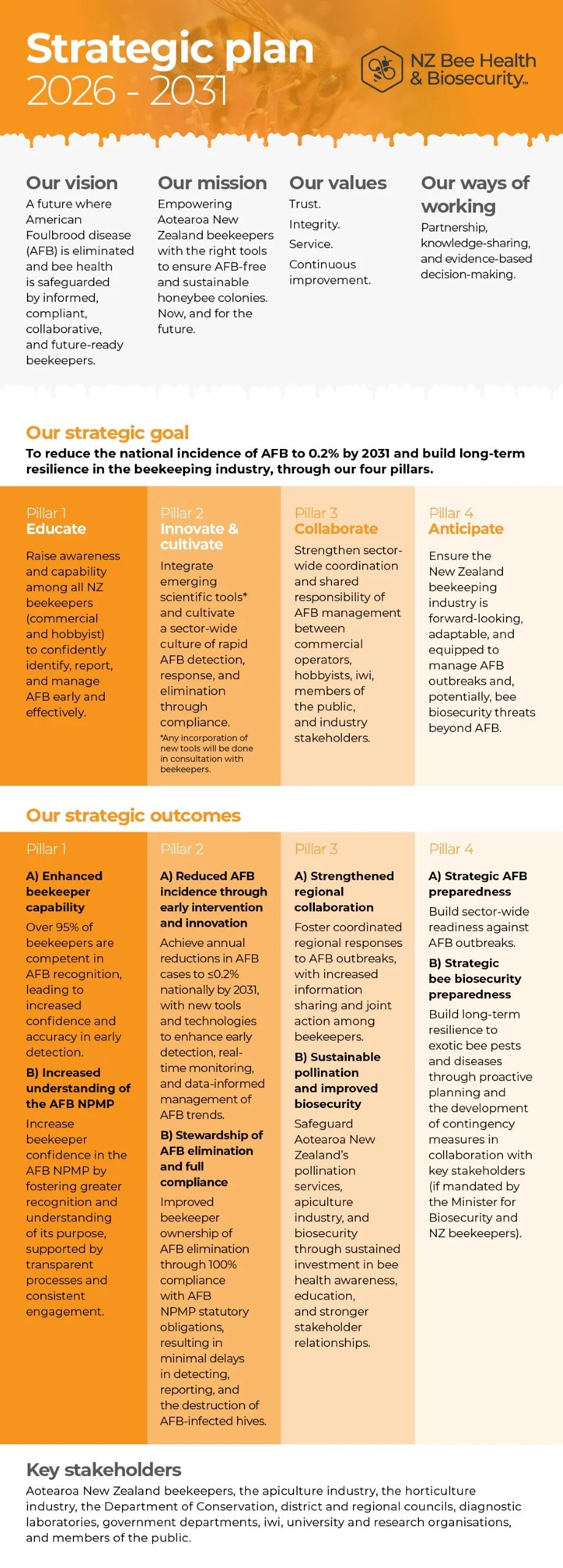 Our Strategic Plan 2026–2031 is built around four pillars that focus on lifting beekeeper capability, accelerating early detection and management of AFB, strengthening sector partnerships, and improving the industry’s adaptability to managing AFB outbreaks.